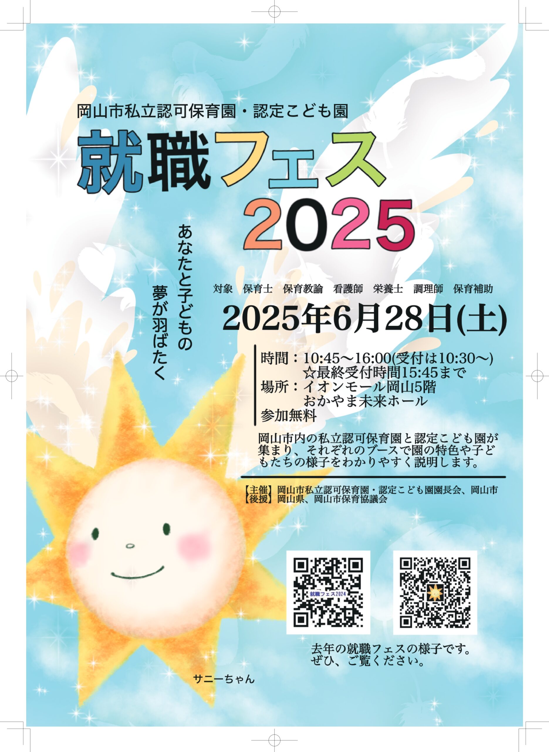 2025.04.10 採用情報 岡山市私立認可保育園・認定こども園 就職フェス2025 岡山市私立認可保育園・認定こども園 就職フェス2025に岡山博愛会保育園も参加します。ぜひご参加ください。 詳しくは、添付資料をご確認ください。