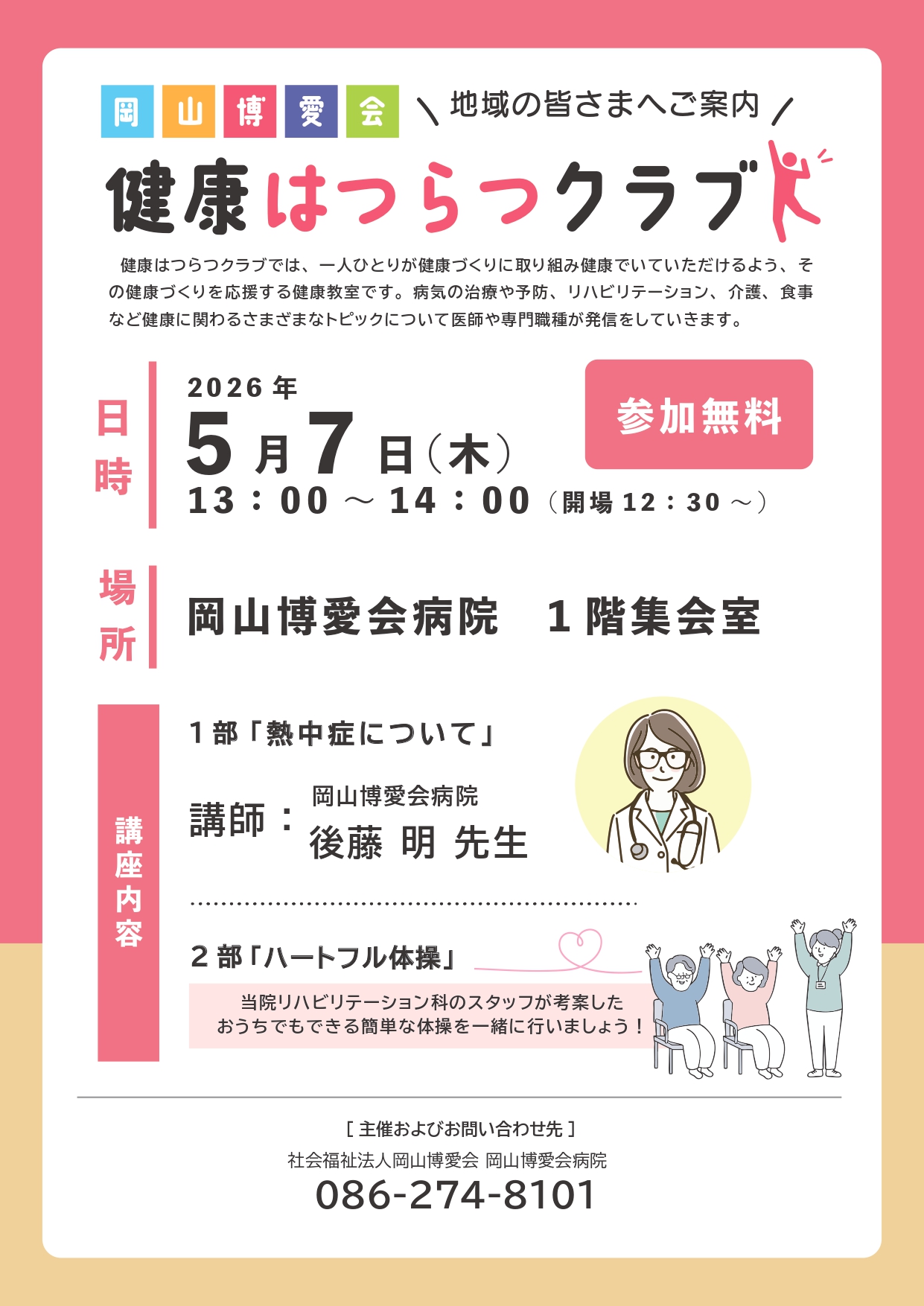 2026.03.05 イベント 健康はつらつクラブ【5月7日 (木)開催】 開催日:2026年5月7日(木) 13:00~14:00 ※開場は12:30~場 所: 岡山博愛会病院 1階集会室 講座内容1部「 熱中症について 」 講師 後藤 医師 2部「ハートフル体操」当院のリハビリテーション科のスタッフが考案したおうちでもできる簡単な体操を一緒に行いましょう! 参加無料です 。お気軽にご参加ください💕