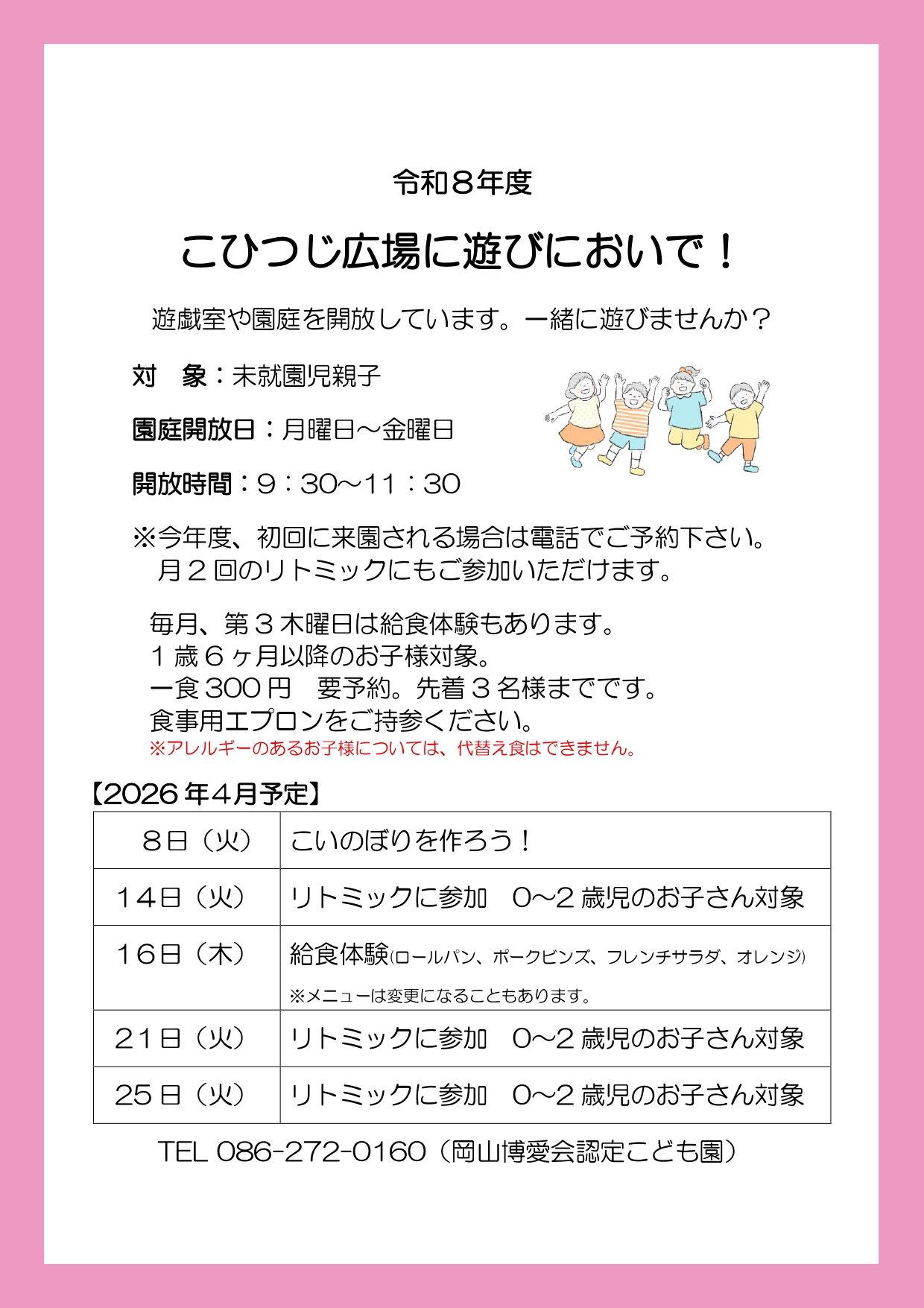 ※今年度、初回に来園される場合は電話でご予約下さい。月2回のリトミックにもご参加いただけます。